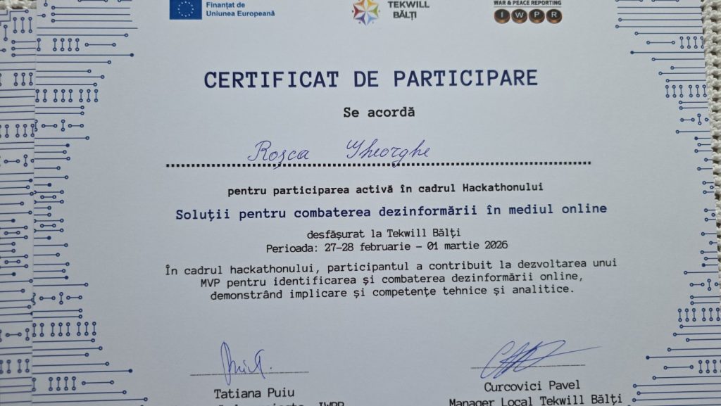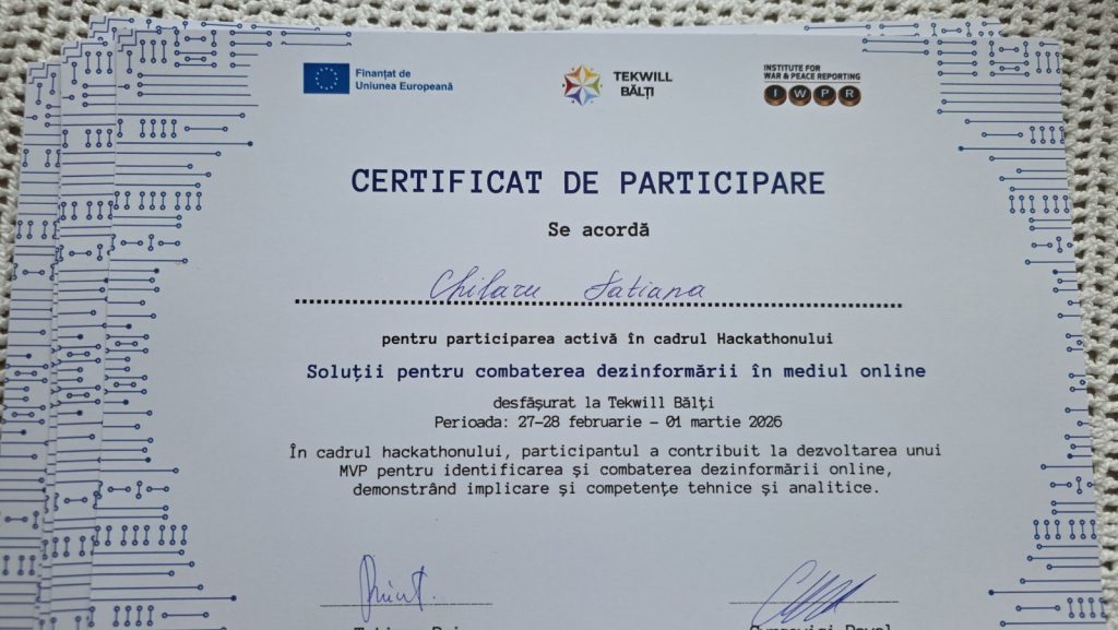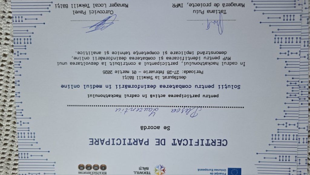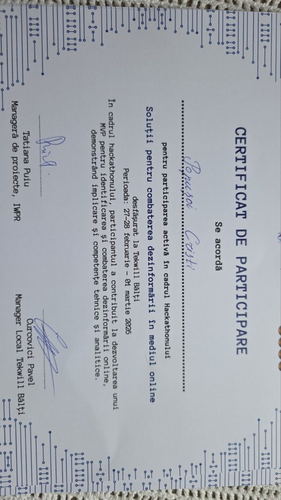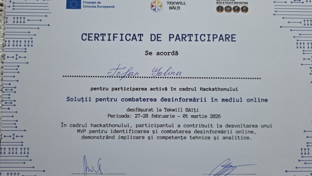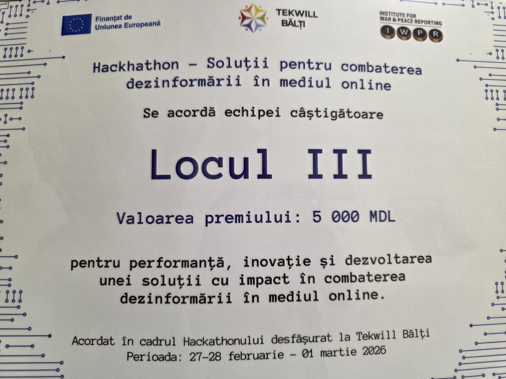 În acest context, echipa de la Colegiul Politehnic, formată din elevi și profesori- Popușoi Cristian, Pleșca Laurențiu, Tofan Galina, Roșca Gheorghe și Chilaru Tatiana – a participat la Hackathonul „Soluții pentru combaterea dezinformării în mediul online”, unde a obținut locul III, fiind recompensată cu un premiu de 5000 de lei pentru performanță, inovație și dezvoltarea unei soluții cu impact în combaterea dezinformării în mediul online.